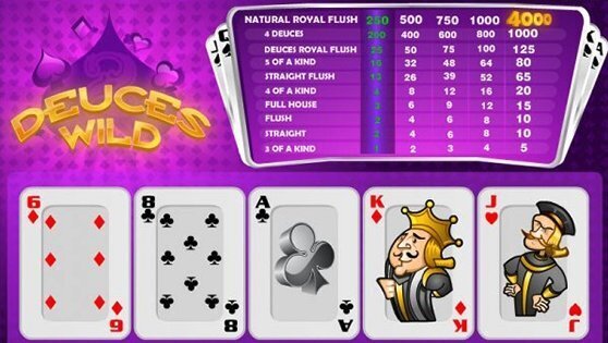 In this video poker game, all twos get classed as Wilds. That means that they can substitute all other cards to form winning combos. So, wins here can happen more frequently. As a consequence, the paytable in Deuces Wild is tighter than in other video poker games.