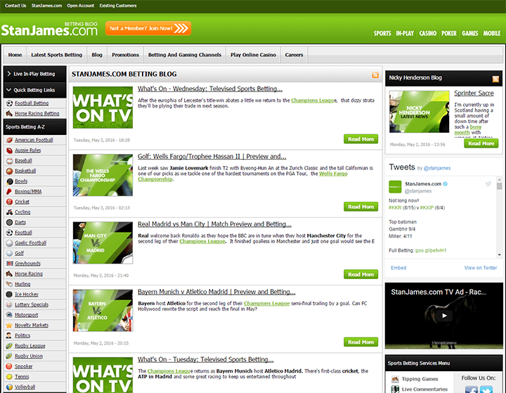 UK and Irish customers will be right at home with Stan James. On the left, they have their full list of sports listed, but links to traditional markets, such as cricket, football, golf, horse racing, and tennis. There are also quick links to British and Irish sports happening now, along with in-play betting and live streaming links.